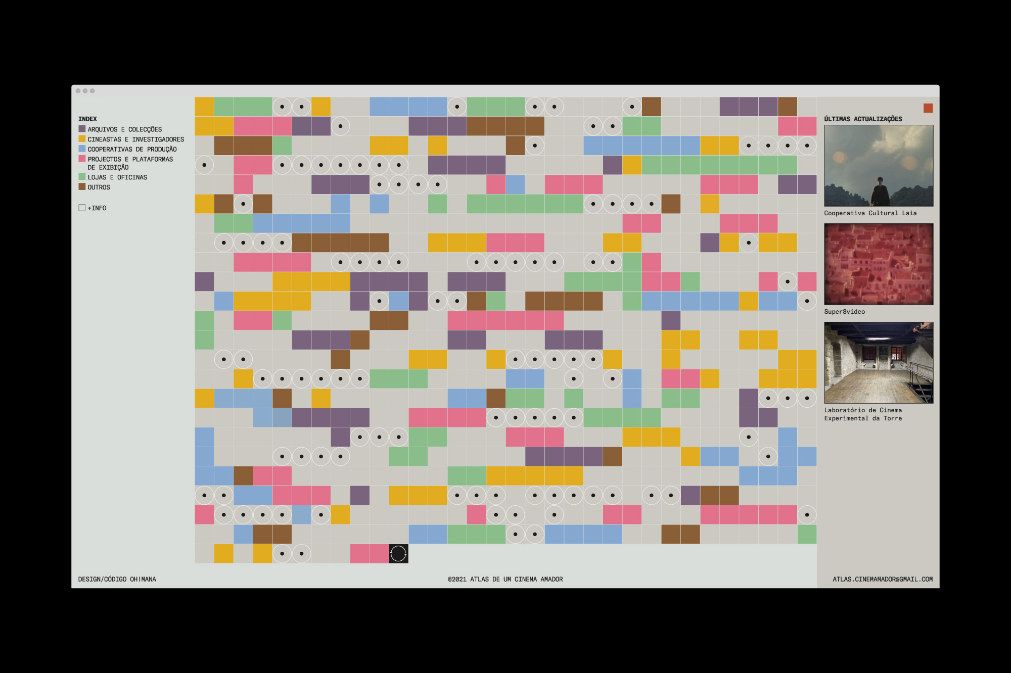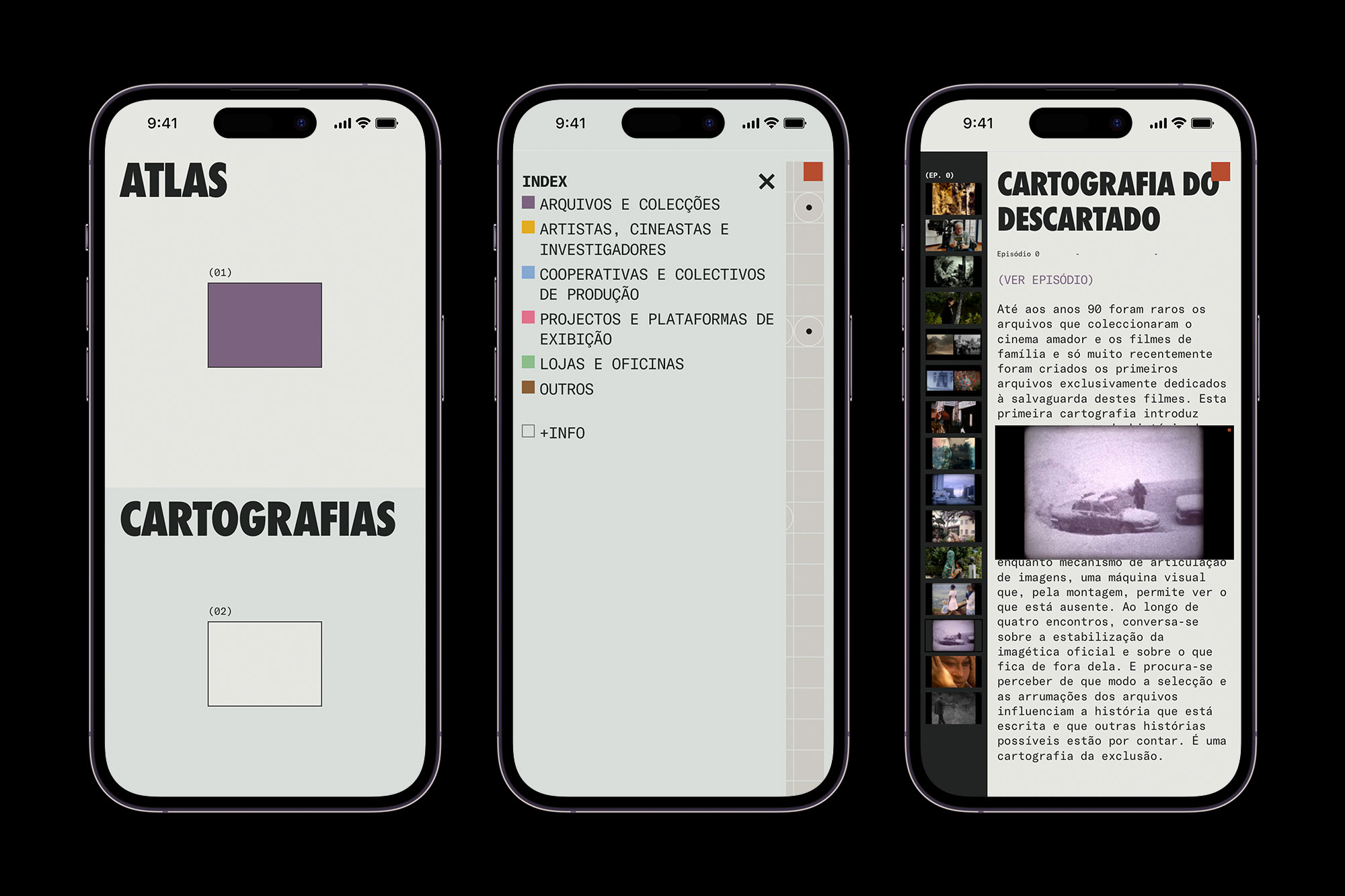 Visual identity and web development of the platform Atlas. This project comprises a series of 13 episodes, each one presenting cartographies and potential paths, among others, through an alternative cinema without a stabilized name. Additionally, the platform includes a mapping of information and references from collections, archives, researchers, as well as creators who tenaciously and resiliently delve into the material essence of cinema, seeking the inception of their image's creation.