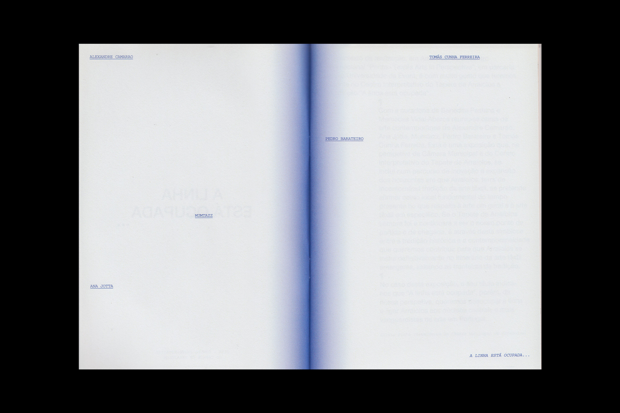 Visual identity and exhibition catalogue created for the collective exhibition "A linha está ocupada ..." featuring artworks by the artists Alexandre Camarao, Ana Jotta, Mumtazz, Pedro Barateiro, and Tomás Cunha Ferreira. The exhibition took place at CITA - Centro Interpretativo do Tapete de Arraiolos and organized by Forum Ponto - Textile Art in Perspective.