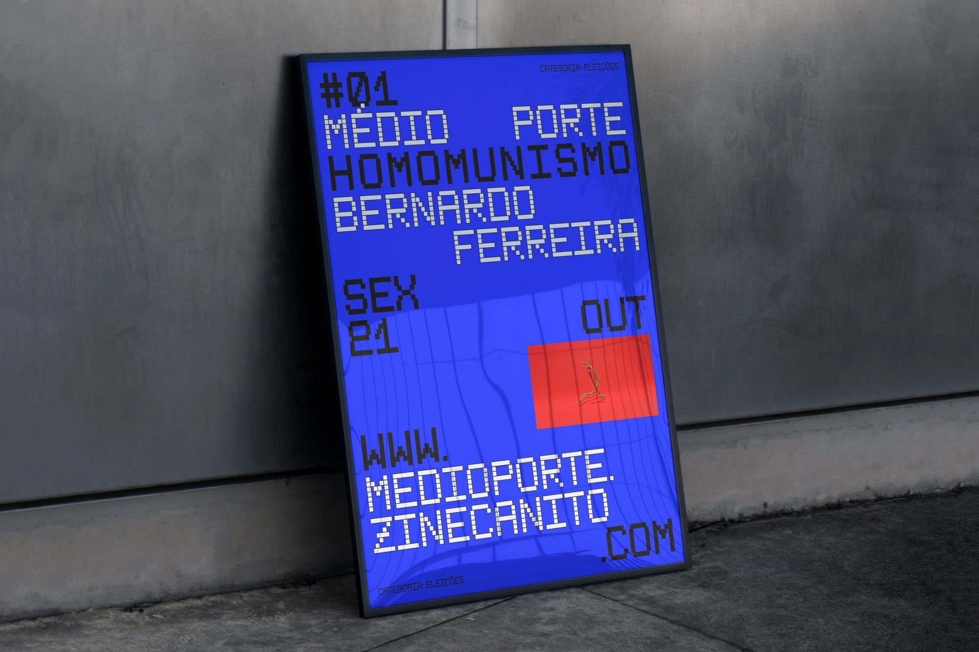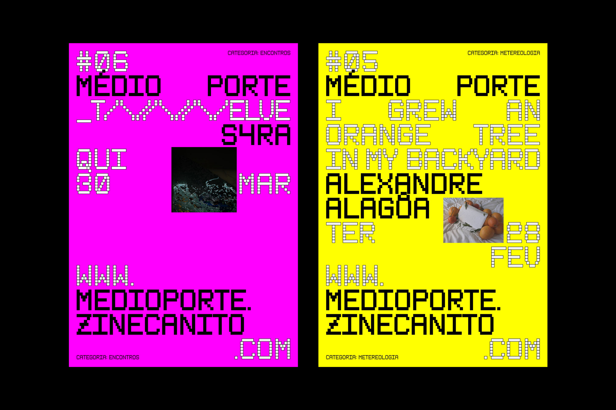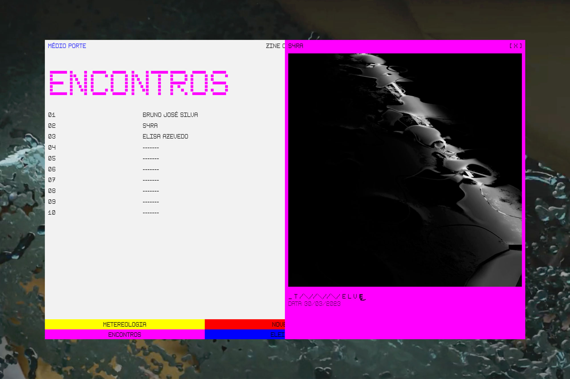 Médio Porte is a project conceived by Zine Canito with the aim of providing artists a platform to exhibit their work, adapting to a nostalgic and retro TV teletext format. This unique platform features diverse categories including meteorology, novels, road code, meetings, elections, and classifieds advertisement.