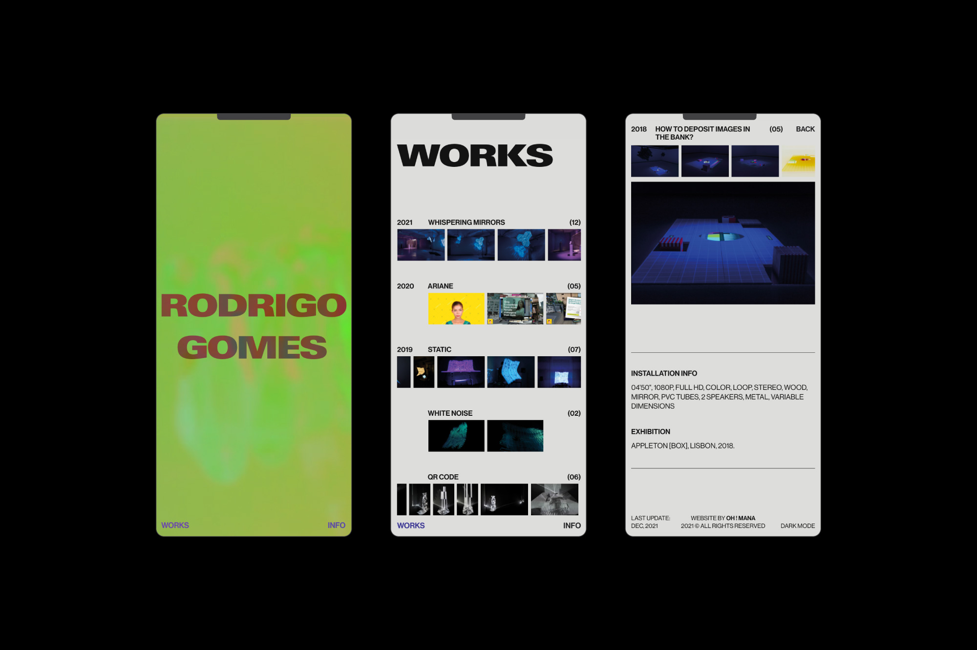 Web development of Rodrigo Gomes portfolio, a portuguese media artist. Through audiovisual sculpture and new media, Rodrigo seeks to explore the space among digital and physical entities by creating a hybrid relationship between matter and images generated by computers and machine learning.