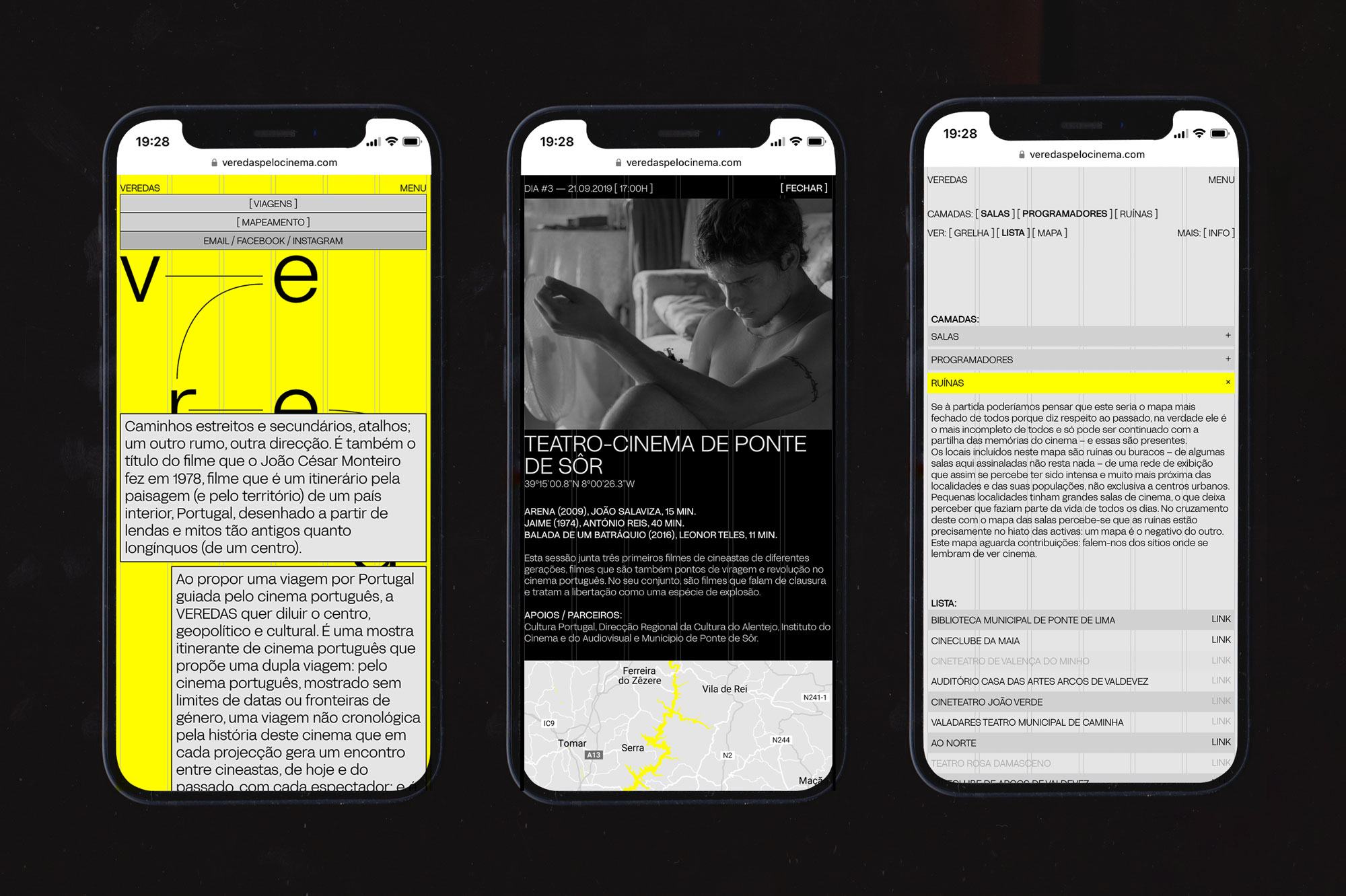 Website developed for Veredas project. This project offers a journey through Portugal guided by Portuguese cinema, dissolving its geographical and cultural center. It's a traveling showcase of Portuguese cinema that proposes a dual journey: through Portuguese cinema, showcased without date limits or genre boundaries; and a journey through the country that Portuguese cinema has envisioned.