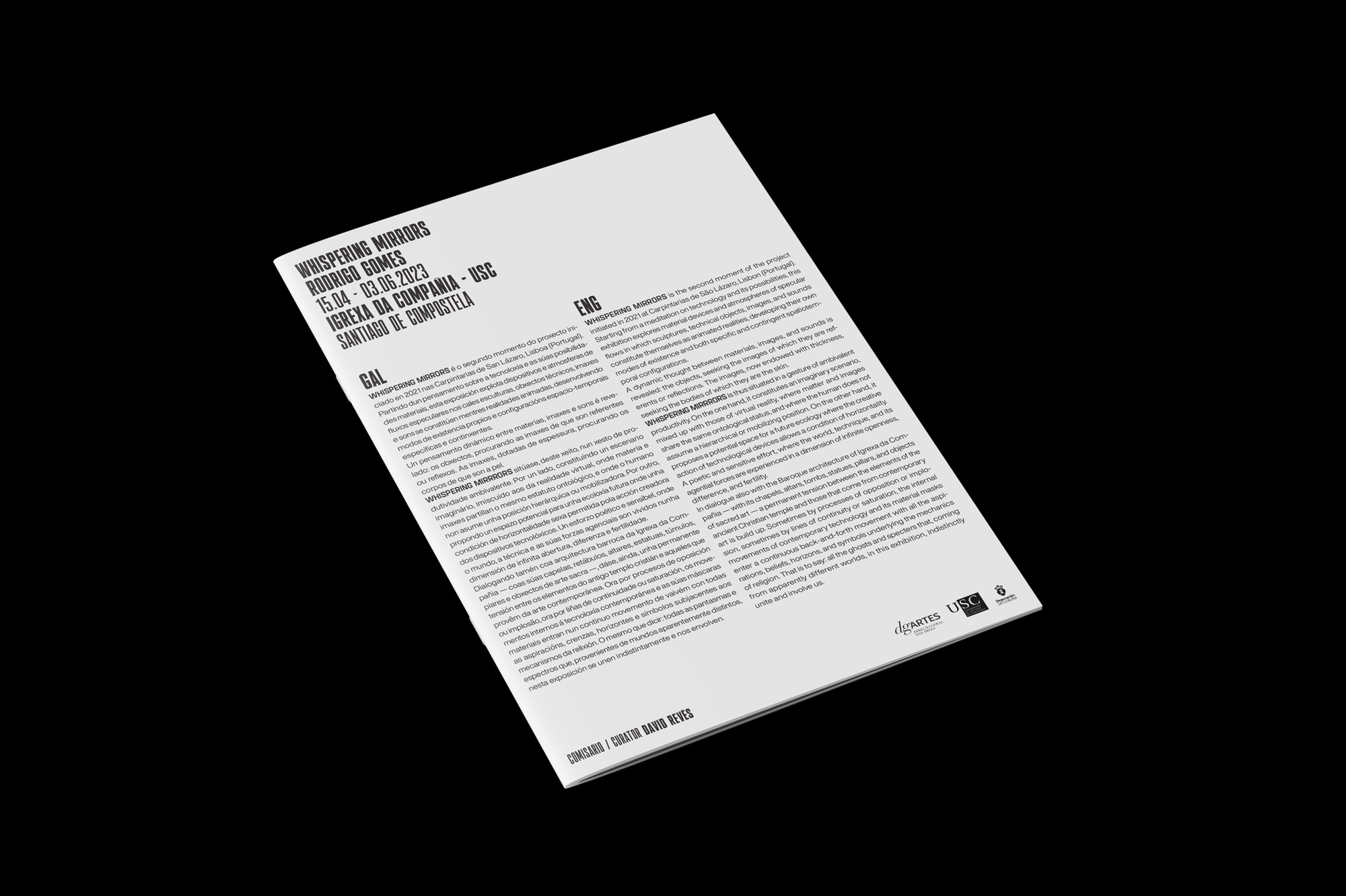Visual identity for the exhibition "Whispering Mirrors" by the artist Rodrigo Gomes. The exhibition was curated by David Revés and took place at Igreja da Compañia in Santiago de Compostela.